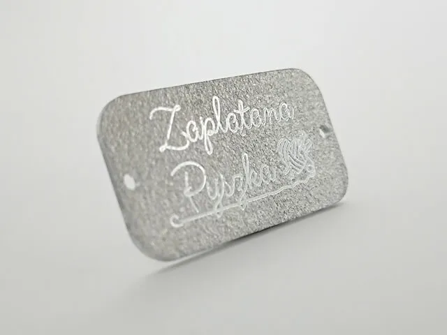 Metka aluminiowa z otworami wycinana i grawerowana z wykorzystaniem frezarki. Produkt zabezpieczany jest specjalnym lakierem do metalu.
